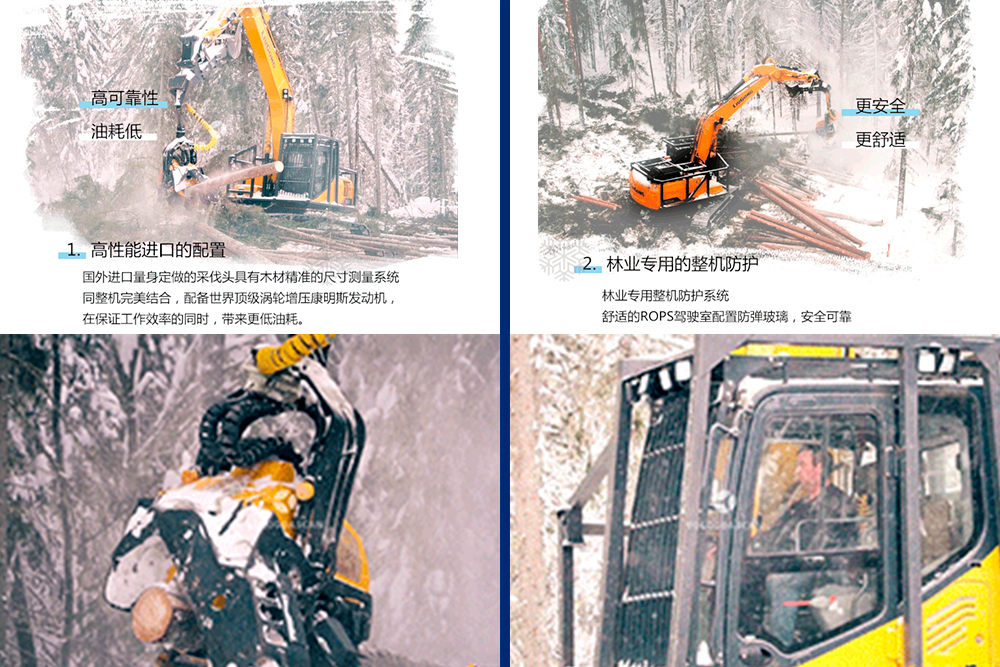 国外进口量身定做的采伐头,完美的结构设计,快速喂料、高速切割,电脑数控、精准定长造材,易于维护和保养,适应各种大小的树。