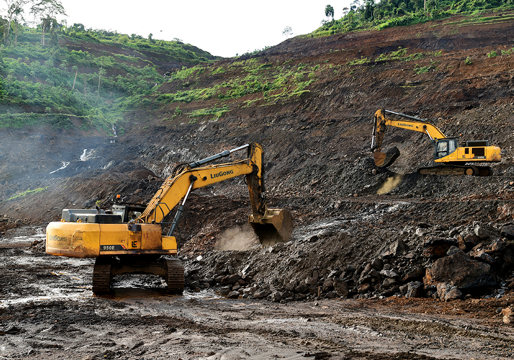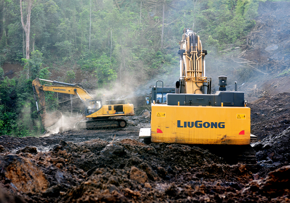 采场位于地势较高的矿山上,周边被非洲独特的高耸大树覆盖着,站在高处边上,可以俯瞰山下的葱葱绿景。矿山已被有序地开采为一层层的阶梯状,两台BB网页版950E挖掘机和一台970E挖掘机正在层次分明的阶梯上挖掘锰矿。
