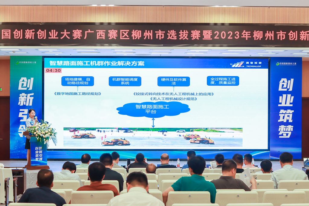 “智慧路面施工机群作业解决方案”项目是国内首例针对水稳层施工的智慧路面施工机群作业解决方案,由广西腾智投资有限公司自主研发。智慧路面施工机群作业解决方案通过自动控制系统、调度平台,实现路面施工机群的智慧管理,从而减少施工成本,提高施工效率,为路面机械无人化、智能化施工提供了全新的解决方案。